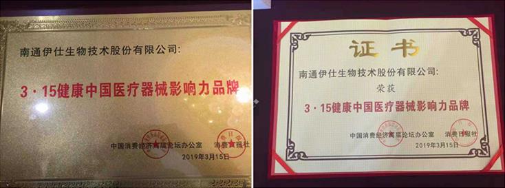 熱烈祝賀伊仕生物榮獲2019年“3?15健康中國醫療器械影響力品牌”