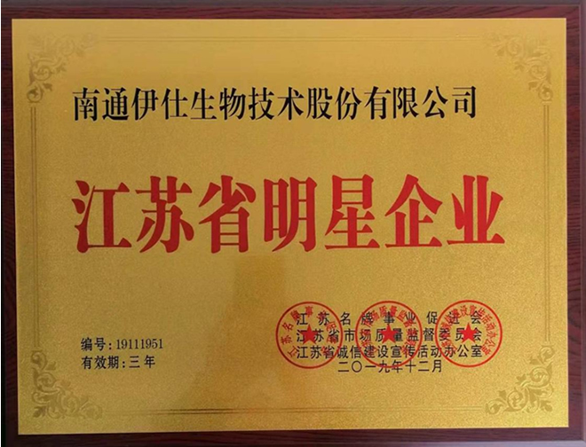 近日,南通伊仕生物技術股份有限公司榮獲“江蘇省明星企業”的稱號。該獎項的評選及頒獎是由江蘇省名牌事業促進會、江蘇省市場質量監督委員會、江蘇省誠信建設宣傳活動辦公室組織舉辦,用以表彰為所屬行業發展做出突出貢獻的先進企業,并授予相關榮譽。此次,南通伊仕生物技術股份有限公司在董事長歐衛軍的引領下,憑借先進的經營管理成果以及較高的市場客戶滿意度,一舉囊獲此項殊榮。