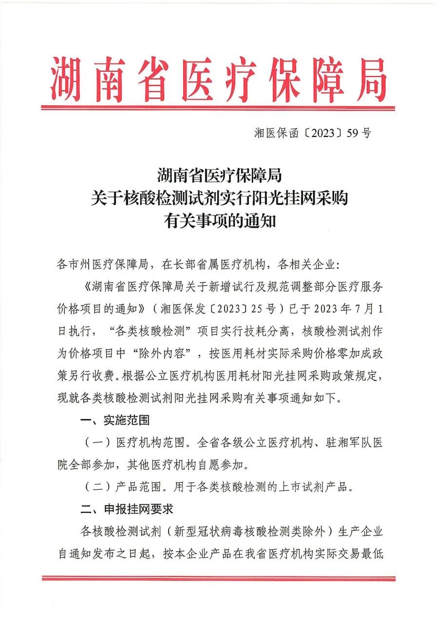 2023年8月16日,湖南省醫保局發布《關于核酸檢測試劑實行陽光掛網采購有關事項的通知》,要求相關生產企業將用于各類核酸檢測的上市試劑產品(新型冠狀病毒核酸檢測類除外)于2023年9月10日前,以湖南省醫療機構實際交易最低價在湖南醫保招采管理系統申報掛網。
