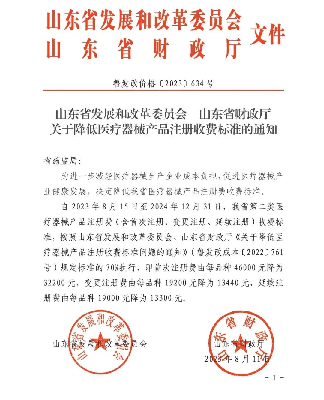8月14日,山東省發展和改革委員會、山東省財政廳《關于降低醫療器械產品注冊收費標準的通知》: