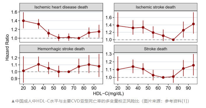 研究者在CVD特異性死亡率中也觀察到了U形關(guān)聯(lián),包括缺血性心臟病和缺血性卒中,但不包括出血性卒中。與參考水平70 mg/dL~79 mg/dL相比,HDL-C <30 mg/dL(HR 1.40,95% CI:1.23~1.59)和>90 mg/dL(HR 1.15,95% CI:1.02~1.30)的受試者缺血性心臟病的死亡風(fēng)險(xiǎn)顯著更高。同樣,對(duì)于缺血性卒中,以70 mg/dL~79 mg/dL作為參考,極低和高HDL-C受試者的相應(yīng)死亡HR分別為1.38(95% CI:1.09~1.74)和1.43(95% CI:1.17~1.74)。