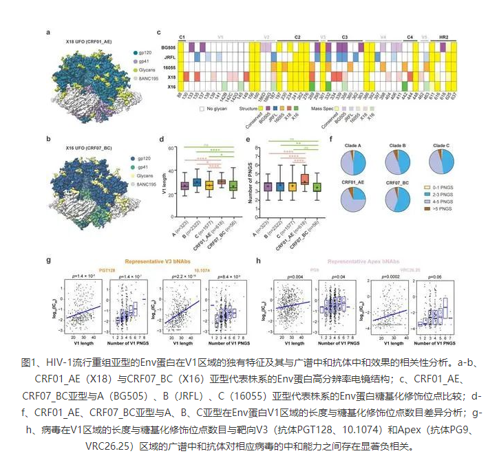 研究團(tuán)隊(duì)首先利用單分子冷凍電鏡技術(shù)與生物大分子質(zhì)譜全面揭示了CRF01_AE和CRF07_BC代表型株系的Env蛋白結(jié)構(gòu)與糖基化修飾(圖1a-c)。隨后從上述研究中獲得的線索出發(fā),對當(dāng)前數(shù)據(jù)庫中六千余條不同亞型的Env蛋白的V1區(qū)域進(jìn)行了跨亞型對比和分析。結(jié)果顯示,相比于其他亞型,CRF01_AE亞型的V1區(qū)域長度顯著增長(圖1d),且糖基化修飾位點(diǎn)數(shù)目顯著增多(圖1e-f)。進(jìn)一步對中和實(shí)驗(yàn)數(shù)據(jù)和V1區(qū)域特征的關(guān)聯(lián)分析則顯示CRF01_AE亞型在V1區(qū)域的上述特征會明顯削弱兩類廣譜中和抗體(分別靶向Env蛋白的apex與V3區(qū)域)對CRF01_AE亞型的中和效果(圖1g-h)。上述研究結(jié)果提示,應(yīng)盡量避免在CRF01_AE亞型的流行區(qū)域開展靶向Apex或V3區(qū)域的免疫聚焦型疫苗或廣譜中和抗體的臨床試驗(yàn)。