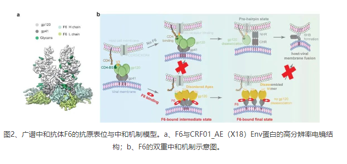 F6是第一株分離自CRF01_AE感染個體的廣譜中和抗體。研究團(tuán)隊(duì)還通過高分辨率冷凍電鏡結(jié)構(gòu)解析揭示了F6在Env蛋白上的詳細(xì)抗原表位(圖2a),并進(jìn)一步通過結(jié)構(gòu)分析與功能實(shí)驗(yàn)驗(yàn)證闡明了F6的新型中和機(jī)制(圖2b):F6一方面通過變構(gòu)效應(yīng)擾動Env蛋白三聚體Apex區(qū)域的穩(wěn)定性,破壞Env蛋白與宿主CD4受體的結(jié)合,另一方面通過誘導(dǎo)三聚體的解體來阻礙Env蛋白介導(dǎo)的病毒包膜與細(xì)胞膜的融合,進(jìn)而抑制病毒對于宿主的入侵(圖2b)。