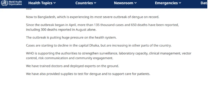 譚德塞補(bǔ)充說,雖然孟加拉首都達(dá)卡的病例開始下降,但該國其他地區(qū)的病例卻在增加。“我們已在孟加拉國部署了專家,并支持當(dāng)局加強(qiáng)監(jiān)測、提高實(shí)驗(yàn)室能力并加強(qiáng)與受影響社區(qū)的溝通。”